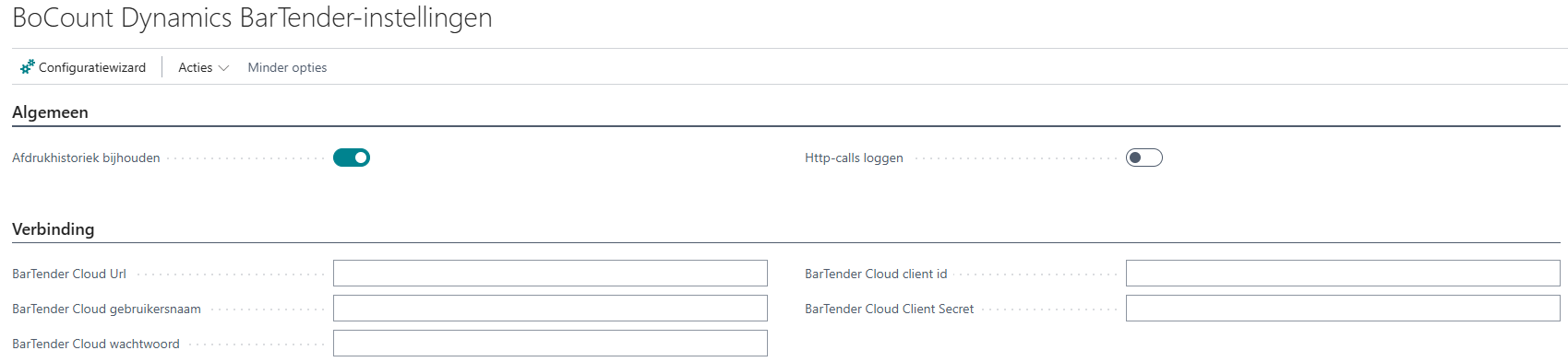 De eenvoudigste manier om van start te gaan met BoCount Dynamics BarTender is de configuratiewizard doorlopen. Die vraagt alle nodige gegevens voor de koppeling met BarTender Cloud op.