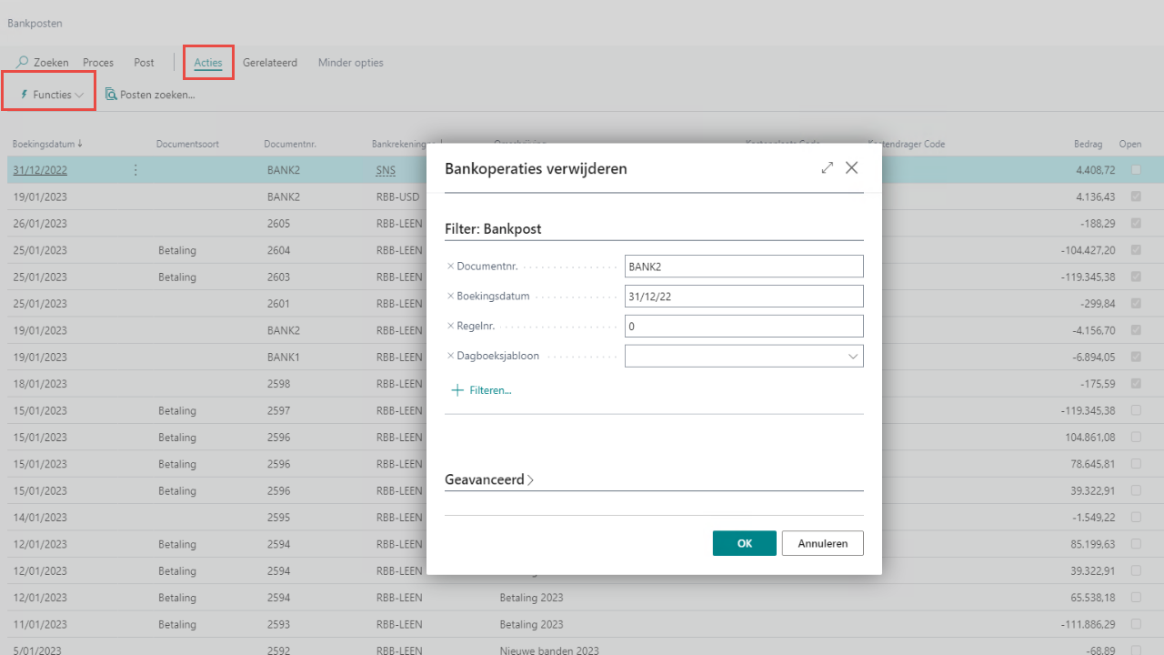 Niet alleen de geselecteerde bankpost zal worden geschrapt maar alle bijhorende posten met hetzelfde documentnummer en boekingsdatum zullen in dit proces geschrapt worden.