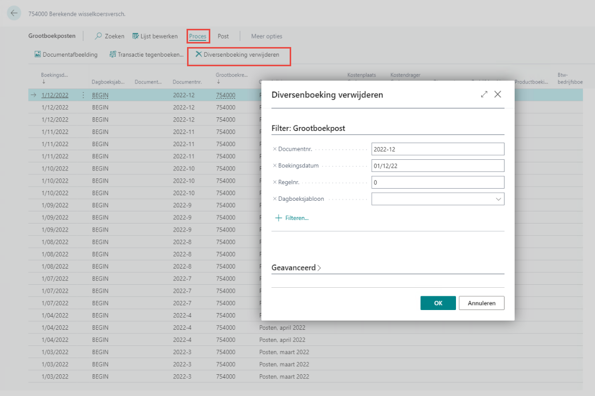 Niet alleen de geselecteerde grootboekpost zal worden geschrapt maar alle bijhorende posten met hetzelfde documentnummer en boekingsdatum zullen in dit proces geschrapt worden.
