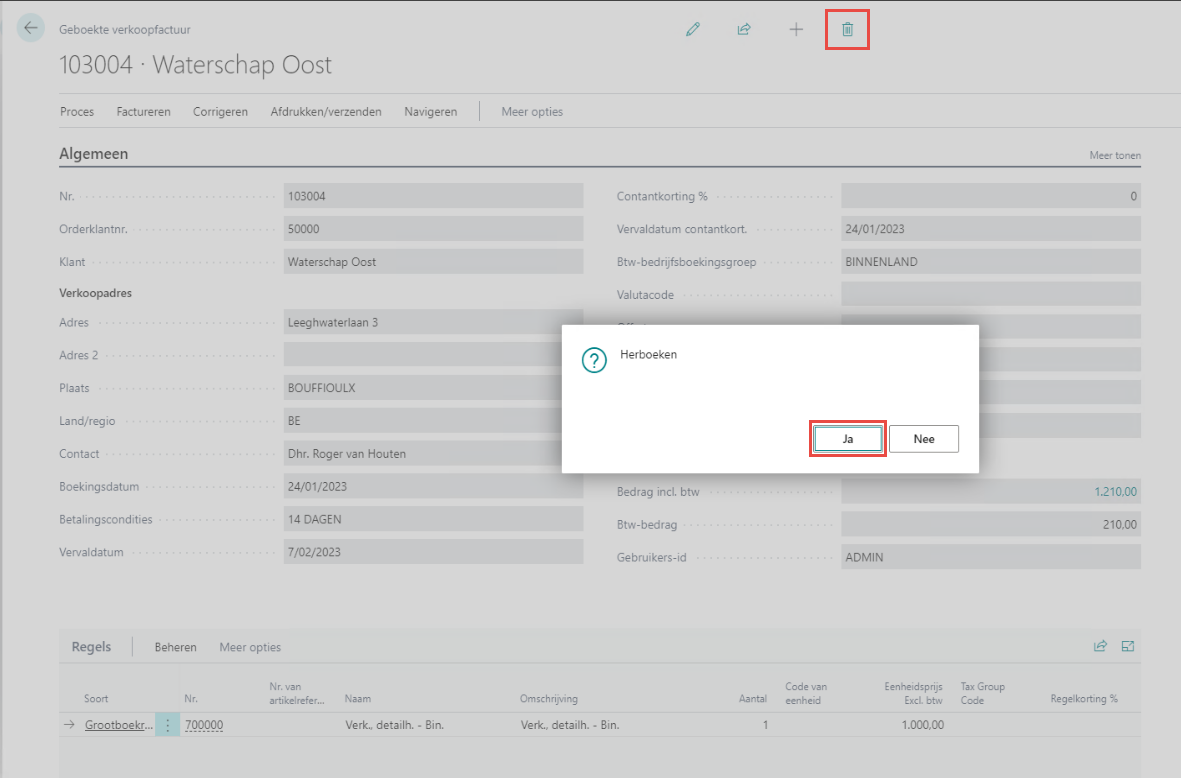Bij het schrappen wordt gevraagd of u de factuur wil herboeken. Indien dit wordt bevestigd wordt de geschrapte factuur (creditnota) terug klaargezet bij de niet geboekte facturen (creditnota's). Op die manier kan u de nodige aanpassingen doen aan het document en die dan opnieuw boeken. De nieuw geboekte factuur zal daarbij hetzelfde nummer krijgen als de geschrapte factuur (creditnota).