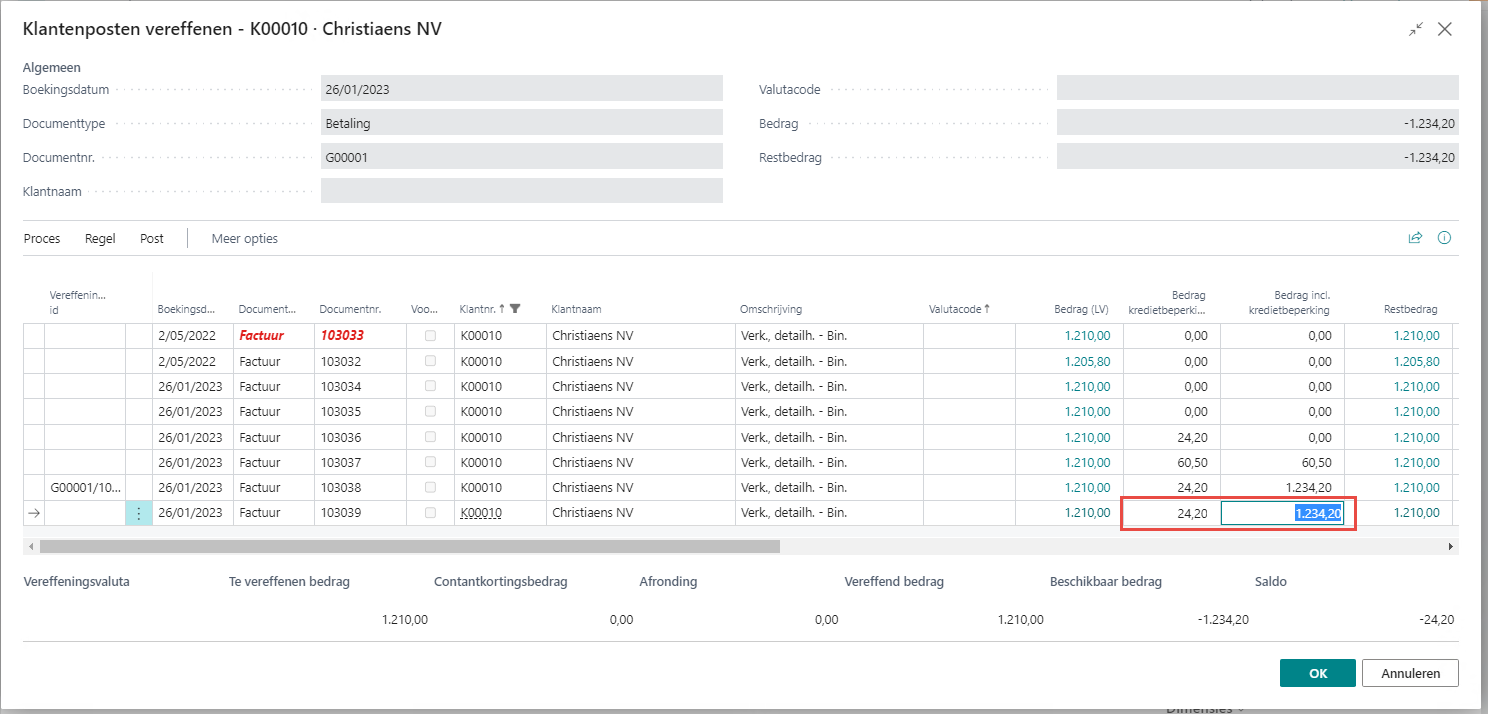 Bij vereffenen van klantenposten in het diversendagboek is het kredietbeperking % en totaal bedrag inclusief kredietbeperking zichtbaar.