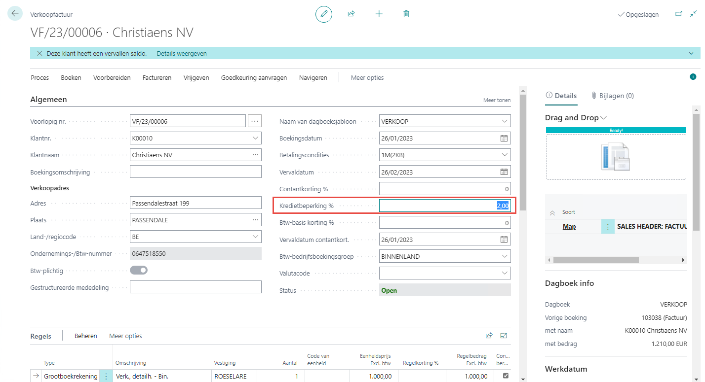 Bij boeken van de verkoopfactuur wordt het kredietbeperking % overgenomen, alsook het totaal bedrag van de kredietbeperking berekend en bijgehouden. De kredietbeperking % en bedrag wordt tevens bijgehouden op de klantenpost van de factuur.