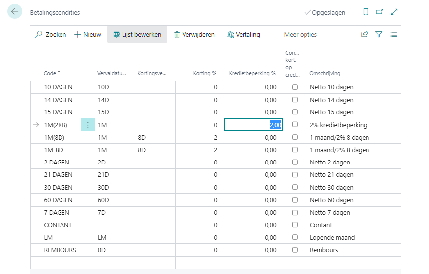 Op de betalingscondities kan een veld kredietbeperking % ingevuld worden. Kredietbeperking is niet combineerbaar met contantkorting. Bij ingave van kredietbeperking dient de contantkorting gelijk te zijn aan 0.