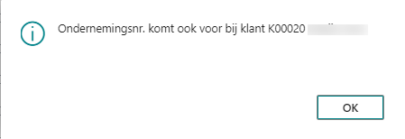 Wanneer reeds een klant bestaat met hetzelfde btw- of ondernemingsnummer bestaat, dan zal dit gemeld worden zodat de gebruiker kan beslissen of de net aangemaakte klant wel nodig is. Dit is niet blokkerend maar louter informatief. Soms is het maken van een nieuwe klantenkaart met eenzelfde btw- of ondernemingsnummer gewenst.