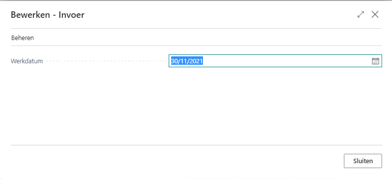 Indien in de BoCount Dynamics instellingen is onder Boekhoudinstellingen Werkdatum vragen is aangevinkt zal bij openen van het financieel dagboek gevraagd worden de werkdatum in te stellen.