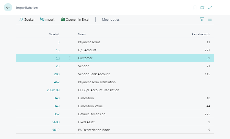 Voor elke tabel kan de respectievelijke pagina geopend worden via de actie Import.
