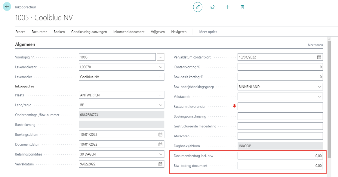 - Deze bedragen dienen ingevuld op een inkoopfactuur (of creditnota). Wanneer deze niet zijn ingevuld, zal dit leiden tot een fouf bij boeken. Bij boeken zal de som van de lijnen gecontroleerd worden tov. deze bedragen en zal bij afwijking leiden tot het niet kunnen boeken van de factuur.
