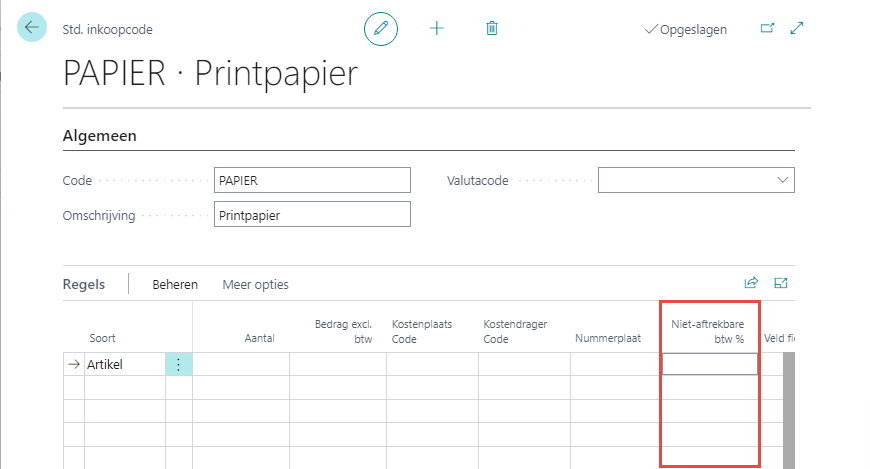 Wanneer een regel op een inkoopfactuur wordt gemaakt, dan wordt de niet-aftrekbare btw overgenomen van:
