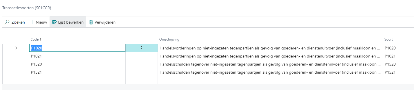 4/4/2023 2 minutes to read Transactiesoorten Via het zoekvenster (Alt+Q) gaat u op zoek naar Transactiesoorten (S01CCR). De transactiesoorten worden automatisch aangemaakt bij installatie.