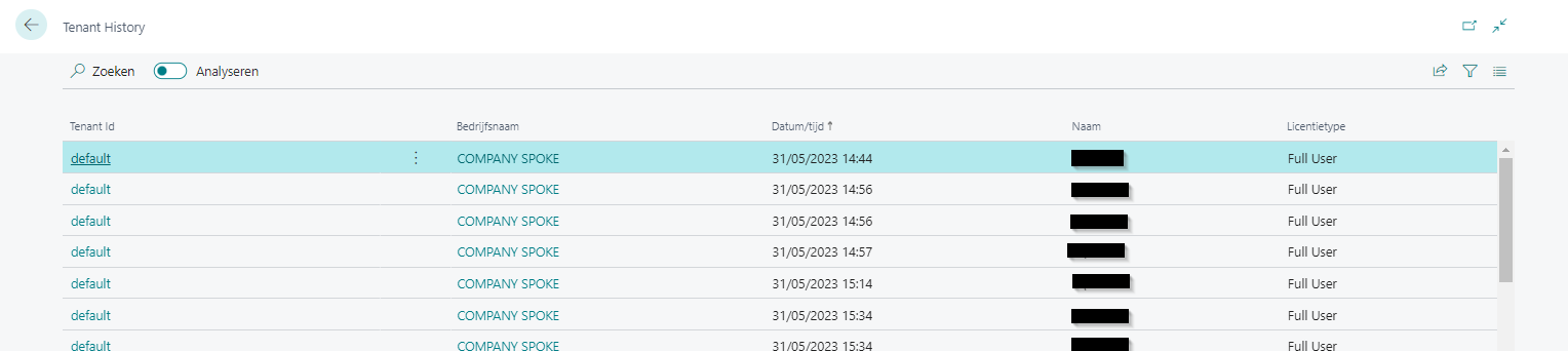 De tenant historiek toont alle aanmeldingen op de omgeving.
