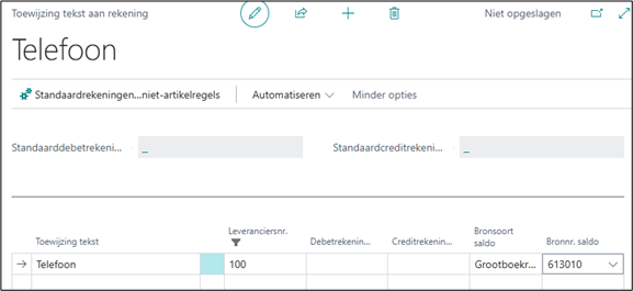 U kan een tekst ingeven, bijvoorbeeld “telefoon” of “telefonie” of “GSM*” & deze standaard koppelen aan een bepaald grootboekrekeningnummer Indien u het leveranciersnummer in dit scherm verwijdert dan zal het sleutelwoord voor ALLE leveranciers gekoppeld worden aan dit grootboekrekeningnummer.