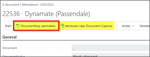 U kan ook kiezen voor de BoCount functionaliteit “documentkop aanmaken”. Deze knop is zowel beschikbaar op de lijstpagina als op een E-document. Deze piste staat u toe om enkel de documenthoofding te laten herkennen. De standaard werkwijze die regeltekst probeert te herkennen wordt in dit geval niet toegepast.