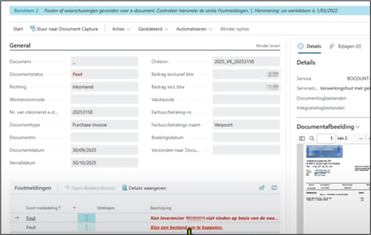 Ziet u in de lijst e-documenten voor een e-document de documentstatus “fout” dan klikt u op het documentnummer om het e-document te bekijken en controleert u de fout onder “foutmeldingen”