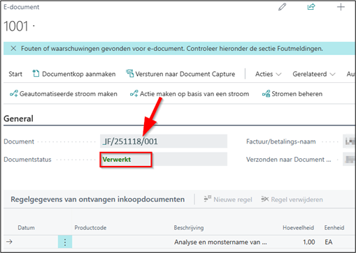 Wanneer u een inkomende factuur op deze wijze verwerkt dan wordt er een document (volgens het type bepaald op de leverancierskaart) voorbereid: een inkoopfactuur (99% van de gevallen) of een inkooporder. Het nummer van het aangemaakte document kan u dan vanuit het e-document aanklikken om het voorbereidde document te openen.