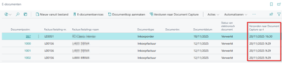 Er is ook kolom in de lijst e-documenten die aangeeft of een factuur naar Document Capture werd verstuurd en wanneer.