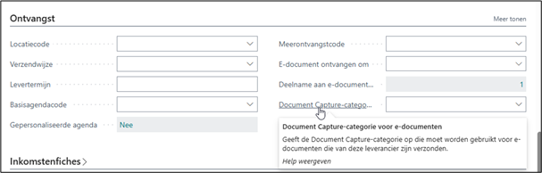 Op de leverancierskaart kan u vervolgens onder “document Capture-categorie voor e-documenten ingeven” een waarde ingeven. Wenst u voor bepaalde leveranciers dat de facturen altijd via Document Capture verlopen dan vult u hier die aangemaakte e-document categorie in (bv “INKOOP”).