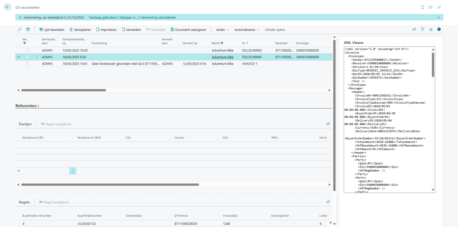 Via de knop "Verwerken" kunnen de geselecteerde EDI-documenten manueel verwerkt worden binnen Business Central.