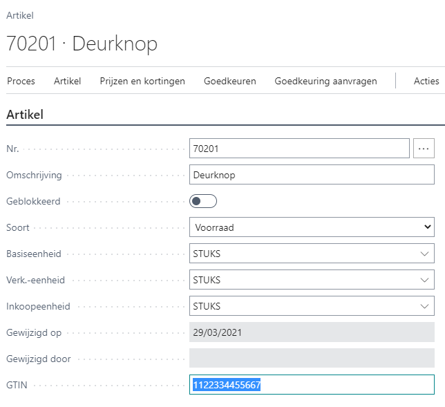 Indien er op bovenstaande 2 niveaus geen EAN-code wordt gevonden, dan zal het systeem als laatste gaan kijken op de artikelkaart zelf. Daar kan het veld GTIN ingevuld worden met de EAN-code van het artikel. Let wel, deze EAN-code wordt dan uitgedrukt in de basiseenheid van het artikel.
