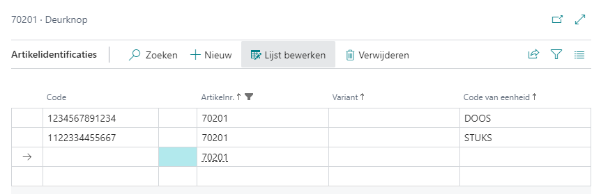 Van op de artikelkaart kan je via de acties > Artikel > Identificaties de EAN-codes invullen. Dit telkens uitgedrukt in een bepaalde eenheid.