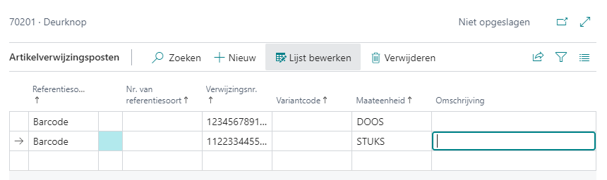 Op de artikelkaart via Gerelateerd > Artikel > Artikelreferenties kunnen barcodes ingegeven worden. Artikelreferenties worden enerzijds gebruikt om artikelcodes en -omschrijvingen op te geven zoals ze bij de klant gekend zijn, maar ook om EAN-codes toe te kennen. Doe dit telkens ook weer in functie van de eenheidscode.