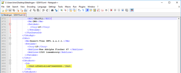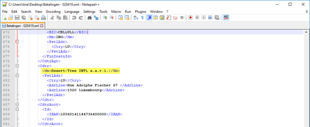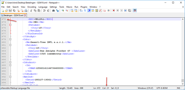 In bovenstaande voorbeeld zit de fout op lijn 672 en positie 31. Wanneer u het XML-bestand opent in een programma zoals Notepad++ kan u gemakkelijk de positie van de foutmelding terugvinden. In dit geval is de BIC-code niet correct.