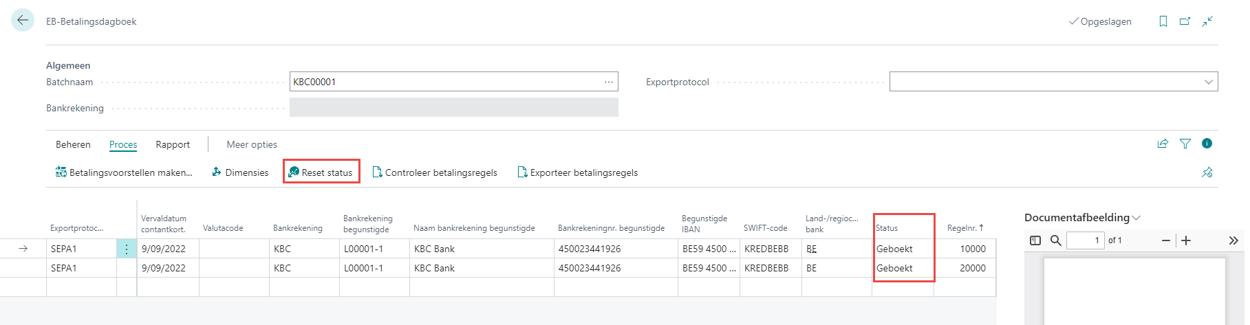Daarna kan u in het betalingsbestand in Business Central de lijnen terug openzetten via het lint Tab Proces > Knop Reset status. In het veld Status zal u merken dat de status wordt gewijzigd van Geboekt naar Aangemaakt.