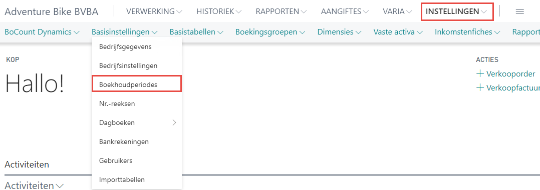 Om nieuwe boekingsperiodes aan te maken, gaat u via het Rolcentrum > Tab Instellingen > Groep Basisinstellingen > Boekhoudperiodes.