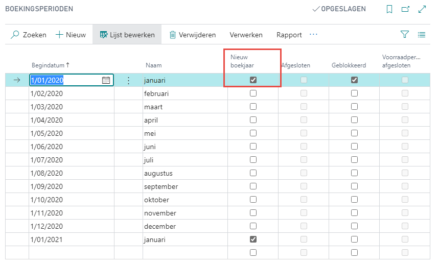 Achteraf kunnen de boekhoudperiodes manueel aangepast, geschrapt en/of opnieuw gecreëerd worden indien nodig. Dit is mogelijk ook al is geboekt in die periode (vb.: bij het verlengen van een boekjaar). Het begin van een nieuw boekjaar wijzigen kan aan de hand van het aan-/afzetten van het vinkje Nieuw boekjaar.