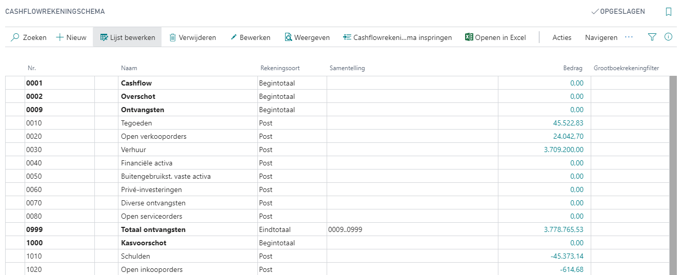 Gelijkaardig aan het grootboekrekeningschema, wordt er een rekeningschema samengesteld voor de cashflow prognoses. Dit schema kan volledig handmatig samengesteld worden. Ga via het zoekvenster (Alt + Q) naar het Cashflowrekeningschema. Klik op de knop Bewerken om per lijn de volgende gegevens te definiƫren: