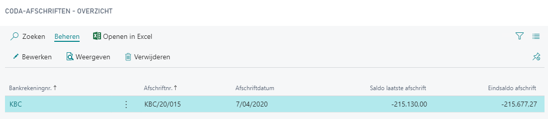 De opgeladen CODA-bestanden kunt u opvragen vanop de bankrekeningkaart via de knop CODA-afschriften (onder Tab Proces). Via Tab Beheren > Bewerken kunt u het CODA-afschrift verder bewerken.