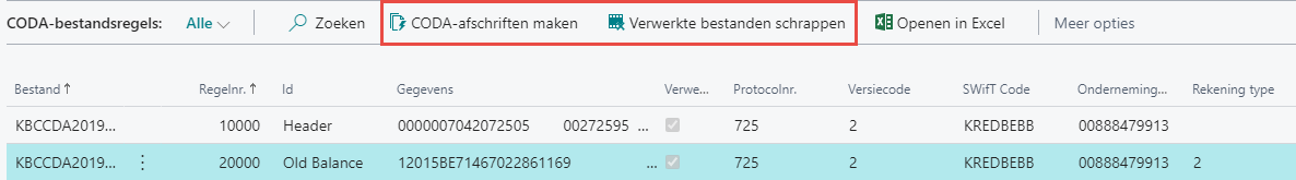 In principe gebeurt dit opladen van bestanden automatisch, maar bij de initiƫle opzet of bij problemen kan het interessant zijn om manueel te werken. Via het Rolcentrum > Tab Varia > Groep Elektronisch bankieren > CODA-bestandsregels kunt u een CODA-bestand inlezen. Het CODA-bestand kan informatie bevatten van verschillende bankrekeningen en zelfs van verschillende bedrijven.