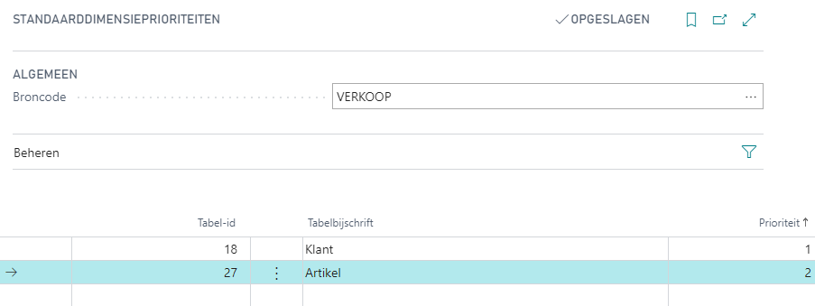 Via het Rolcentrum > Tab Instellingen > Groep Dimensies > Standaarddimensieprioriteiten kan u instellen hoe dimensiewaarden worden geselecteerd als er conflicten ontstaan. Een mogelijk conflict kan bijvoorbeeld zijn dat u een verkoopfactuur boekt voor een bepaalde klant op een bepaalde rekening waarbij er zowel aan de klant als aan de rekening voor dezelfde dimensie een dimensiewaarde is gekoppeld. Op dit scherm kan u dan bijvoorbeeld instellen dat voor verkoopfacturen de tabel van de klanten een hogere prioriteit heeft dan de tabel van de rekeningen.