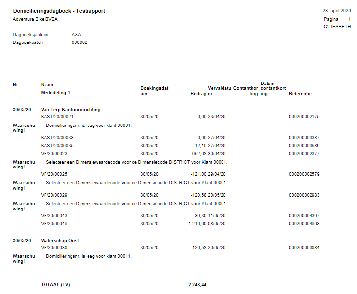 Alvorens te boeken, kan een testrapport geprint worden waarbij een overzicht wordt gegeven van eventuele fouten (ontbrekende velden, onjuiste bankrekeningen…). Het testrapport is terug te vinden via de Tab Rapport.