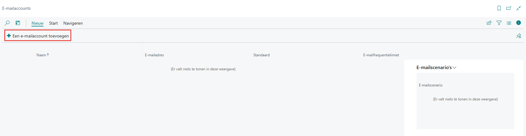 Onder de E-mailaccounts, die u kan terugvinden via de Zoek, kan u instellen vanuit welke mailbox de verkoopfacturen verstuurd mogen worden. U kiest hiervoor in het lint voor Tab Nieuw > Een e-mailaccount toevoegen.