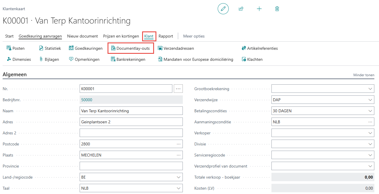 Indien u koos voor de optie mail, dan kan u onder Tab Klant > Documentlay-outs de mailadressen van de klant gaan instellen.