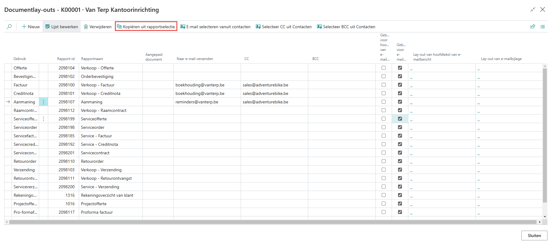 In het scherm dat opent, kan u in het lint klikken op de knop Kopiëren uit rapportselectie om alle standaardrapporten standaard op het scherm aan te vullen. Hierdoor wordt het aanvullen vereenvoudigd. In het lint kan u ook kiezen om het e-mailadres, CC e-mailadres of BCC e-mailadres op te vullen met het e-mailadres ingesteld op de contactkaart. In de lijst kan u nu onder de kolommen Naar E-mail verzenden, CC, en BCC instellen naar welke mailbox de mail verstuurd mag worden.