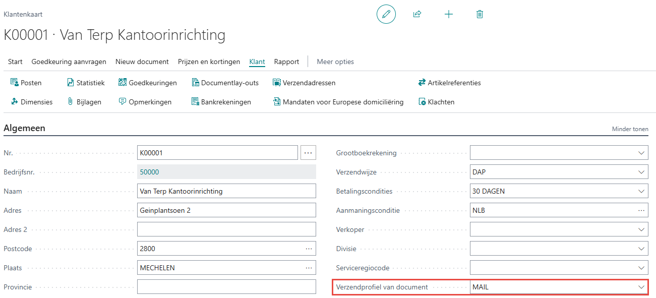 Op de klantenkaart kan u onder het Tabblad Algemeen via het Verzendprofiel van document gaan instellen op welke manier de klant zijn facturen wenst te ontvangen. Hierbij kan u kiezen voor peppol, indien geactiveerd, mail of print.