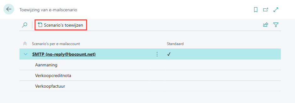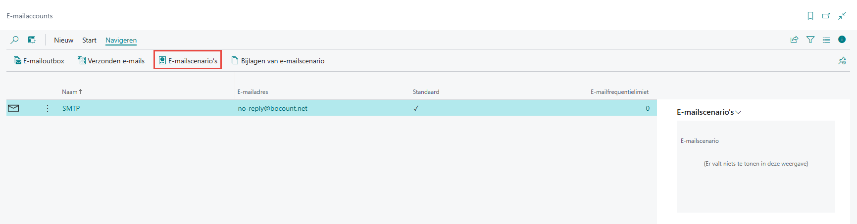 Na het instellen van de mailbox, kan u onder Tab Navigeren > E-mailscenario's gaan bepalen in welk geval welke mailbox gebruikt wordt.