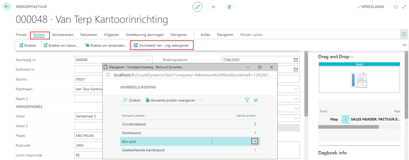 | Tab Boeken > Voorbeeld van boeking weergeven > Btw-post | Met deze knop krijgt u een overzicht van welke bedragen in welke vakken op de btw-aangifte zullen terecht komen vooraleer u de factuur boekt. ![]() |