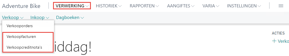 Kies onder het Rolcentrum > Tab Verwerking > Groep Verkoop voor Verkoopfacturen of Verkoopcreditnota’s.