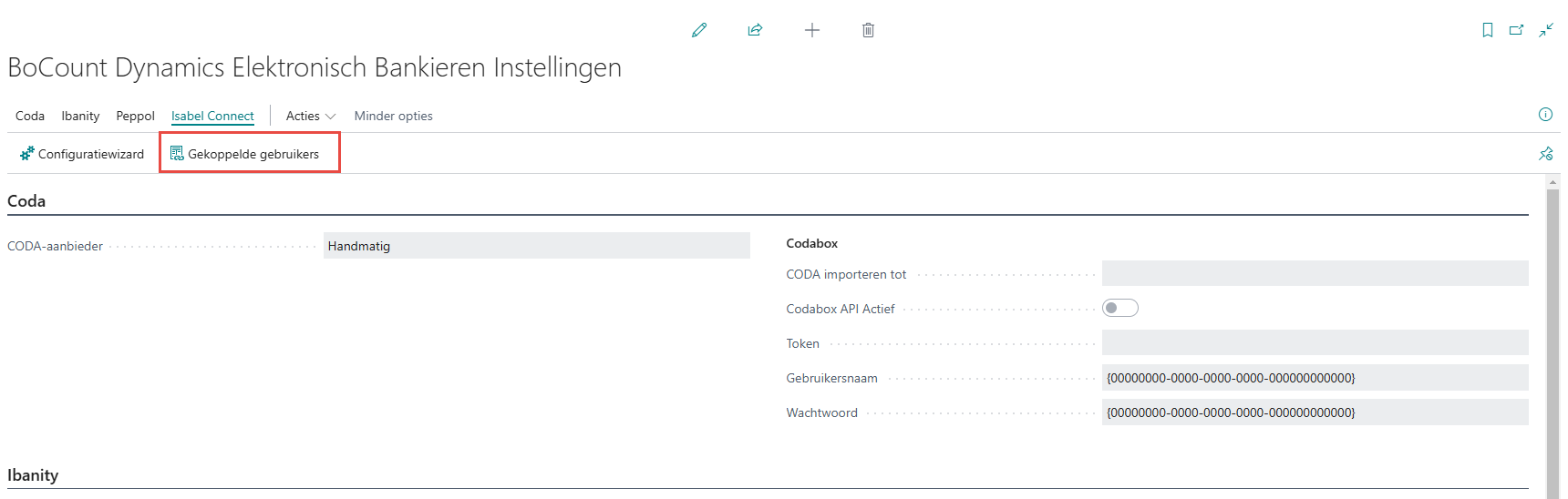 Enkel gebruikers die gekoppeld zijn met Isabel hebben toegang tot de gegevens in Isabel. Gebruikers kunnen gekoppeld worden op het einde van de configuratiewizard of nadien door te gaan in de Bocount Dynamics Elektronisch bankieren instellingen naar Tab Isabel Connect > Gekoppelde gebruikers.