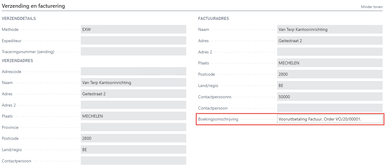 Na het boeken zal de factuur als vooruitbetalingsfactuur verschijnen onder de geboekte verkoopfacturen (Rolcentrum > Tab Historiek > Groep Geboekte documenten > Geboekte verkoopfacturen). In de boekingsomschrijving (onder Tab Verzending en facturering) wordt weergegeven dat het gaat om een vooruitbetalingsfactuur en kan u raadplegen op welk order deze factuur van toepassing is.