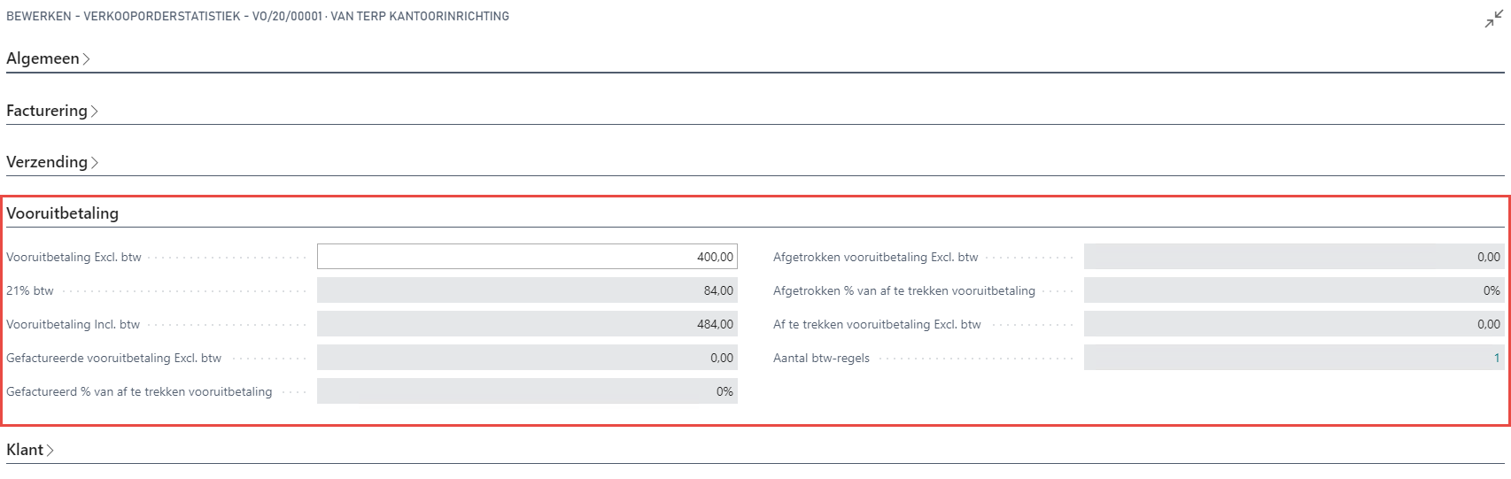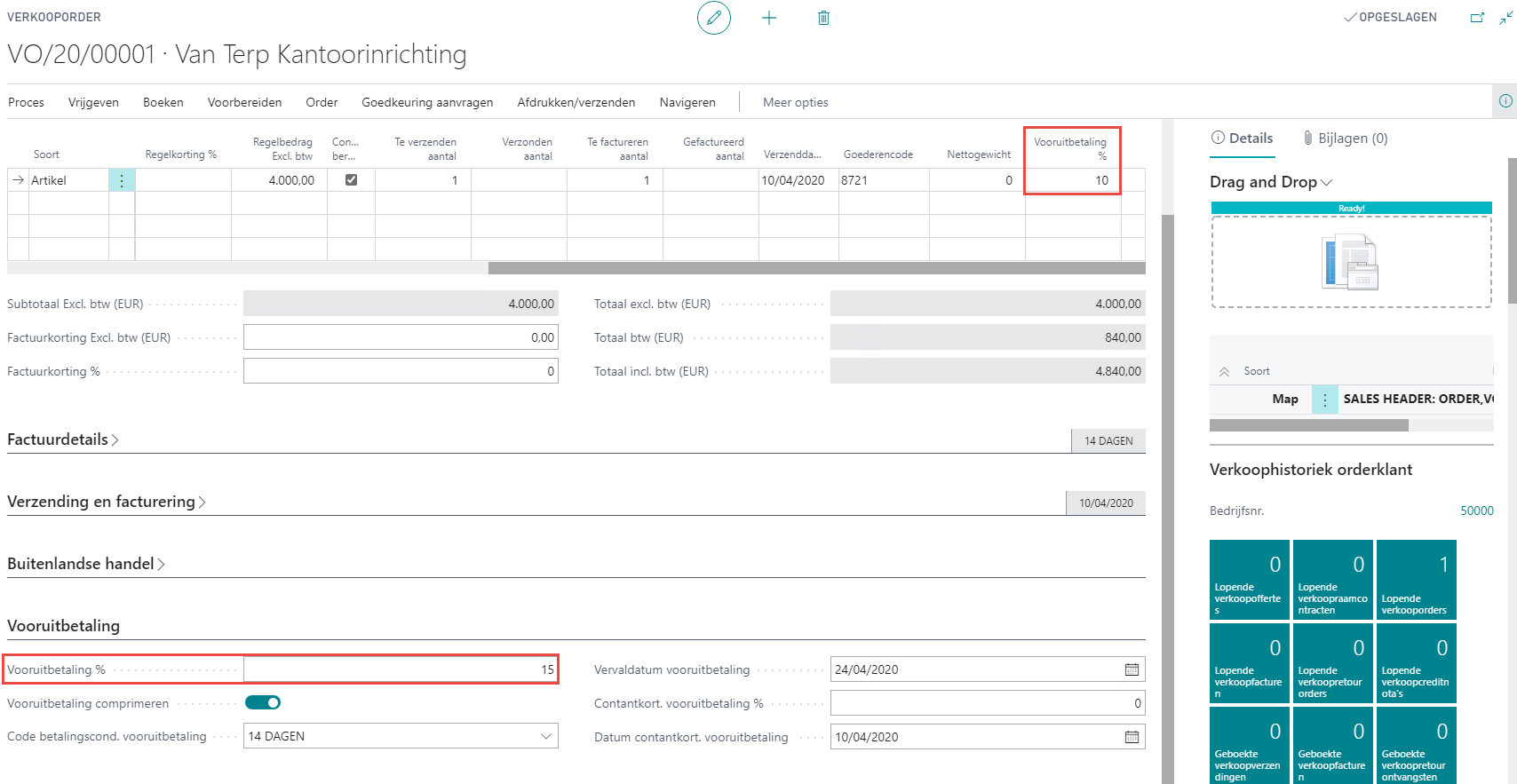 Na het invullen van de vereiste gegevens op het verkooporder, kan het vooruitbetalingspercentage worden ingevuld. Indien u dit al instelde op de klantenkaart of op een artikelkaart, zal deze worden overgenomen op het verkooporder.