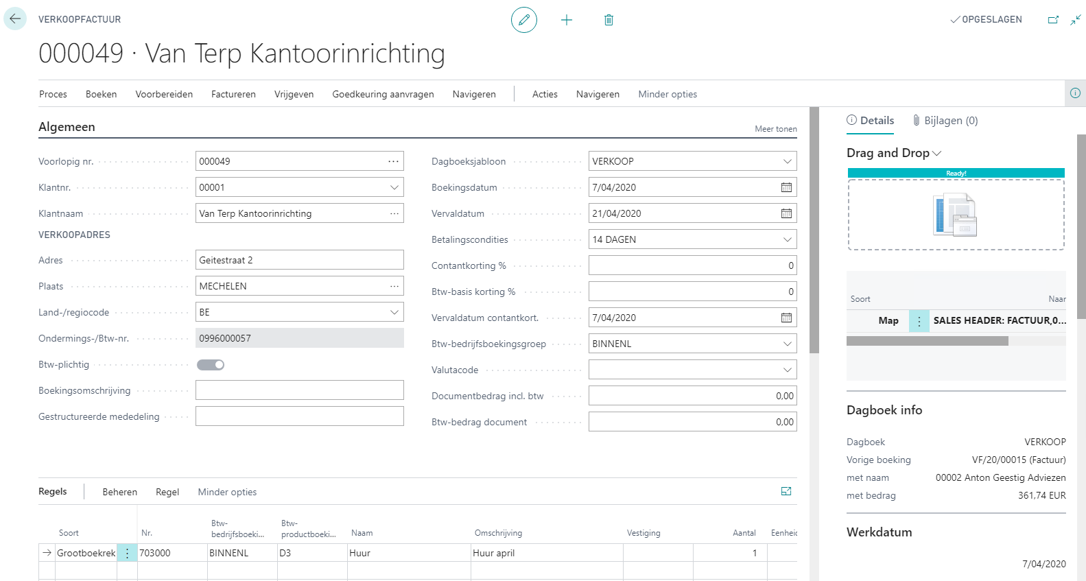 Afhankelijk van de opgegeven parameters worden verkoopfacturen aangemaakt. Deze facturen kunnen geraadpleegd worden via het Rolcentrum > Tab Verwerking > Groep Verkoop > Verkoopfacturen.