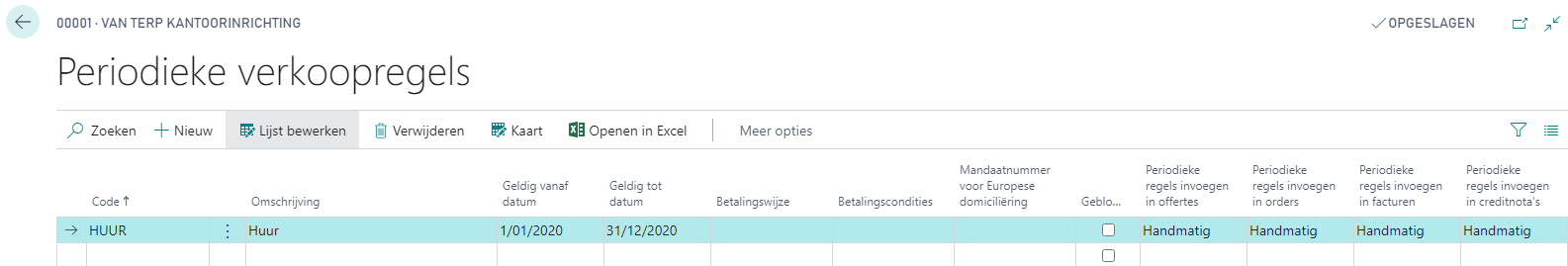 Nadat de standaard verkoopcodes zijn aangemaakt, worden die aan de klanten gelinkt waarvoor van toepassing. Ga via het Rolcentrum > Klanten > Meer opties > Tab Navigeren > Groep Verkoop > Periodieke verkoopregels en voeg op de geselecteerde klant de gewenste verkoopcodes toe. De mogelijkheid bestaat om de codes te beperken in de tijd door gebruik te maken van Geldig vanaf datum en Geldig tot datum.
