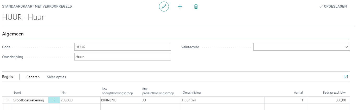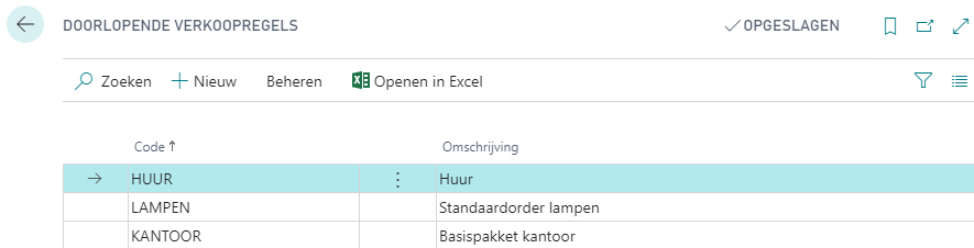 Standaard verkoopcodes kan u gaan definiëren via het zoekscherm > Doorlopende verkoopregels. Elke standaard verkoopregel heeft een code en een omschrijving. Onder de standaard verkoopcode kunnen één of meerdere lijnen gekoppeld worden.
