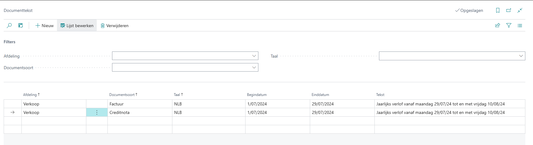 Per afdeling Verkoop, Inkoop, Service en per documenttype kunnen meerdere regels opgegeven worden met teksten.