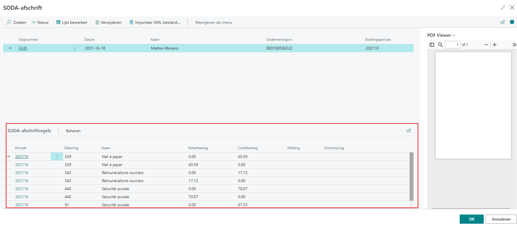 Indien er een SODA-afschrift aanwezig is voor het gekozen diverse dagboek, dan zal het bestand opgehaald worden. Wanneer de bestanden gedownload zijn, verschijnt het diverse dagboek met reeds een aantal lijnen toegevoegd die klaar zijn om geboekt te worden. De boekingsdatum die hiervoor gebruikt wordt, is de laatste dag van de maand en het jaar opgegeven in het SODA-bestand bij de boekingsperiode.