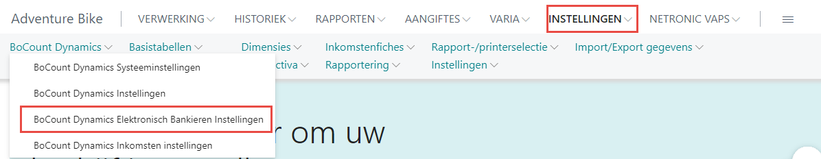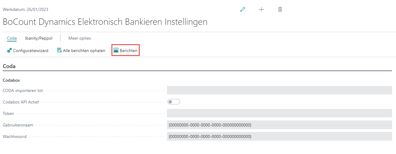 Wanneer CodaBox werd ingesteld in het managementbedrijf, is het mogelijk om de SODA-bestanden van alle individuele dossiers in één keer op te halen. Hiervoor gaat u in het Rolcentrum via het lint naar Instellingen > Bocount Dynamics > Bocount Dynamics elektronisch bankieren instellingen.