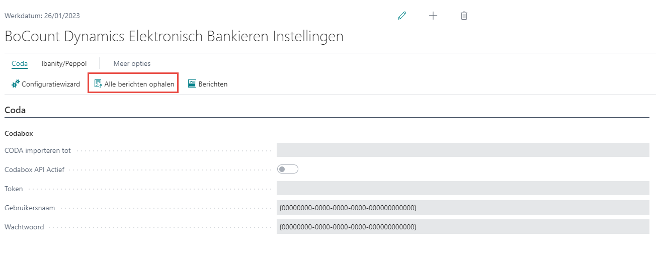 Daarna gaat u naar Tab Coda > Alle berichten ophalen. Hiermee worden alle berichten gedownload via codabox voor de verschillende bedrijven.